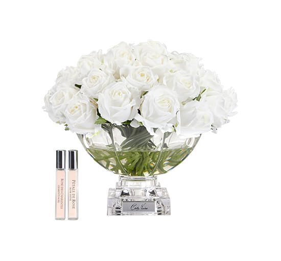 La Piece Maitresse är ett exklusivt set med en dekorativ blombukett som du sprayar med medföljande rumsparfym. Den frodiga buketten består av hela 37 vita rosor av högkvalitativt konstmaterial i glasvas och blir snabbt mittpunkten i rummet. En kombination av bukett och diffuser i ett som inspirerats av det franska provinsbylivet med dofter av blommor, bageri, frukt och teer.