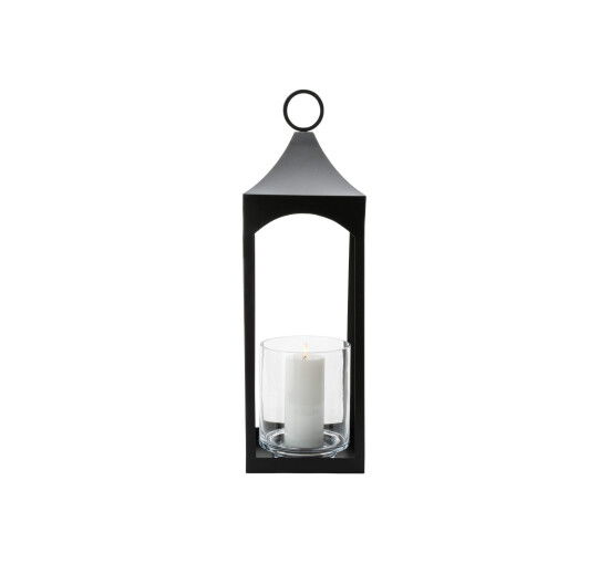 Den eleganta svarta lyktan i metall utan väggar ger ett inbjudande intryck och skapar en stämningsfull atmosfär. Lyktan kommer med en glascylinder att placera blockljus i.