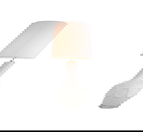 Den eleganta Lambert bordslampan från Eichholtz ger en klassisk och stilren touch till rummet. Med en fot av porslin som liknar en vacker vas, prydd med ett diskret geometriskt mönster och en vacker ”crackle”-effekt. Den cylinderformade lampskärmen i off-white nyans kompletterar designen perfekt.