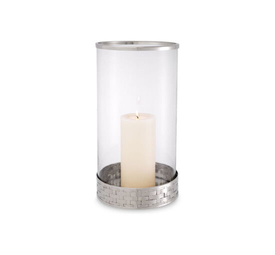 Ge varje tillfälle en extra touch genom att addera en riktig eller falsk pelareljus i den eleganta Lausanne-lyktan. Tillverkad med en robust bas i nickel-finish och ett flätat reliefmönster, är denna lykta perfekt för att skapa en sofistikerad atmosfär på bordet eller spiselkransen.