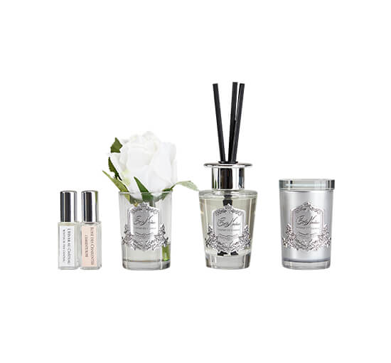 Le Coffret Blanc är ett exklusivt gåvoset från Côte Noire som ger en touch av franskt provinsbyliv till ditt hem. Med en ros i glasvas, två rumsdofter, ett doftljus och en diffuser får du en härlig blandning av blommor, frukt och kryddor.