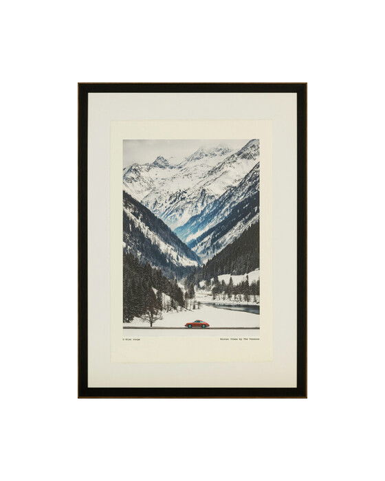 Upptäck skönheten i L’élan Rouge, en konstnärlig skildring av en ensam röd sportbil som korsar en snöklädd dal bland de majestätiska alptopparna. Den intensiva röda färgen på bilen kontrasterar dramatiskt mot den vita vinternaturen, vilket skapar en känsla av äventyr och frihet på landsvägarna.
