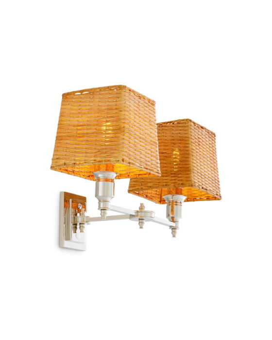 Den eleganta vägglampan Lexington dubbel kombinerar ett nickelram med rottinglampskärmar för att skapa en lyxig och tidlös atmosfär i rummet. Med dess stilrena design och exklusiva materialval är denna lampa perfekt för att addera en touch av elegans till ditt hem.