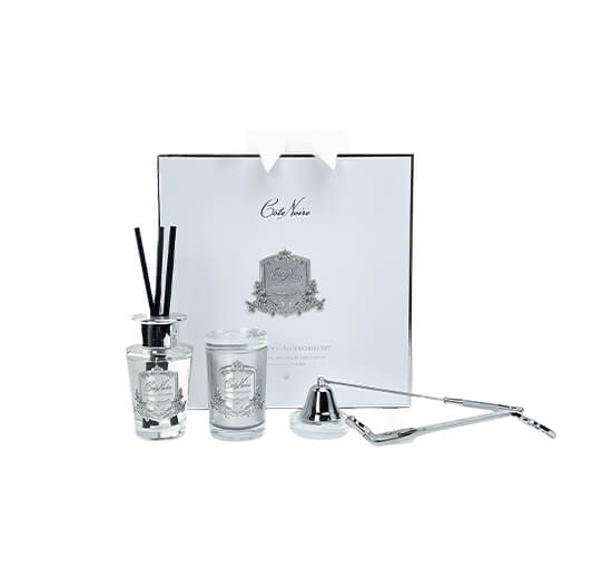 L’Hiver au Château är ett exklusivt gåvoset från Côte Noire som innehåller ett doftljus, en diffuser med doftpinnar, två graverade glasfat, en ljussläckare och en vektrimmer i silverfinish. Gåvosetet är vackert presenterat i en vit och silverfärgad presentbox med sammetsklädd insida, perfekt att ge bort till någon speciell.