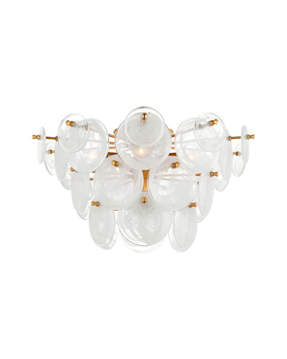 Loire plafond guld L från Visual Comfort är en elegant taklampa som kombinerar italiensk design med moderna inslag. Med böljande silhuetter och handblåsta skivor i vitt strié-glas ger den en distinkt belysningseffekt till ditt rum.