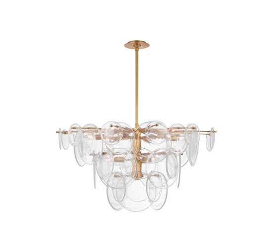 Loire takkrona i guld och klarglas L är en elegant och modern taklampa från Visual Comfort, designad av AERIN. Den inspireras av italiensk elegans från mitten av 1900-talet och kombinerar dynamiska silhuetter med mjukt ljus som filtreras genom handblåsta skivor i vitt strié-glas.