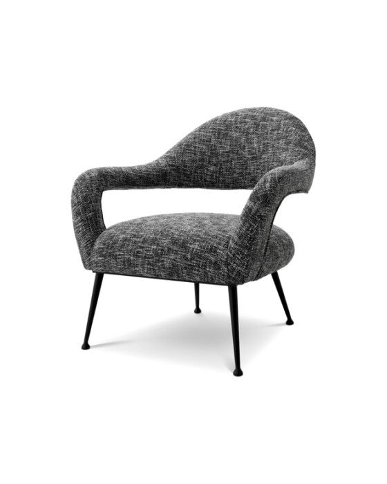 Den eleganta fåtöljen Lombardi har en klädsel i sober Cambon black som kombinerar svarta, grå och vita fibrer i liknande estetik som klassisk tweed. De böjda formerna och de avsmalnande svarta fötterna fulländar det sextiotalsinspirerade utseendet.