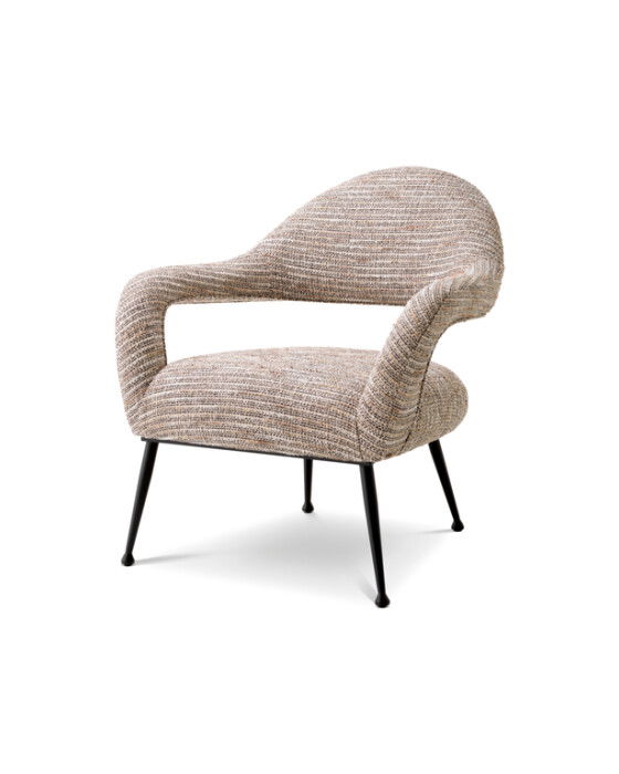 Den eleganta fåtöljen Lombardi har en klädsel i sober Mademoiselle beige som kombinerar beiga färger i liknande estetik som klassisk tweed. De böjda formerna och de avsmalnande svarta fötterna fulländar det sextiotalsinspirerade utseendet.