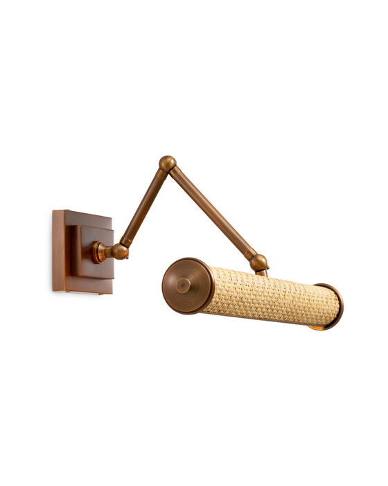 Den antika mässingsfinishen och de naturliga rottingdetaljerna ger vägglampan Luca en varm och organisk känsla. En harmonisk kombination av strukturerad rotting och rik, åldrad metallglans skapar en elegant atmosfär som passar perfekt för sofistikerade interiörer.