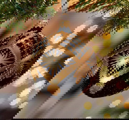Skapa en förtrollande atmosfär i hemmet med denna elegant blå julgranskula från Lux. Den har ett vackert mönster i guld som smyckar julgranen och skapar en genuin julkänsla. Kollektionen Lux erbjuder handgjorda glaskulor i olika färger och former med detaljerade mönster, vilket ger en exklusiv touch till din juldekoration.