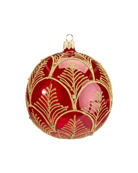 Dekorativ rödfärgad transparent julgranskula med ett vackert mönster i guldglitter från Lux. Skapa en förtrollande atmosfär i hemmet med denna handgjorda glaskula. Perfekt för att dekorera julgranen och skapa en genuin julkänsla.