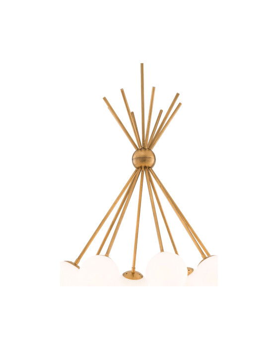 Den snygga sfäriska funkislampan från Eichholtz har en stomme i antik mässingsfinish och glasglober i vitt glas. En vacker lampa som ger en personlig touch till ditt hem och lyser upp rummet på ett elegant sätt. Taklampan har åtta armar med en glaskupol i vitt glas på varje arm. Observera att ljuskällor inte ingår.