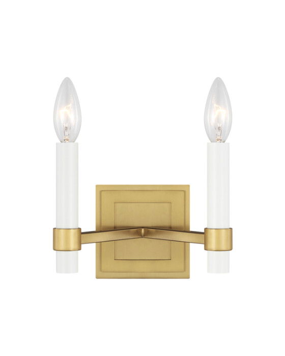 Marston vägglampa dubbel mässing från Visual Comfort har en klassisk och sofistikerad design med en rektangulär mässingsplatta och två eleganta ljushållare i kandelaberstil. Den varma mässingsfinishen och den smala silhuetten gör den perfekt för att ge ett stilrent och stämningsfullt ljus i hallar, vardagsrum eller matsalar.