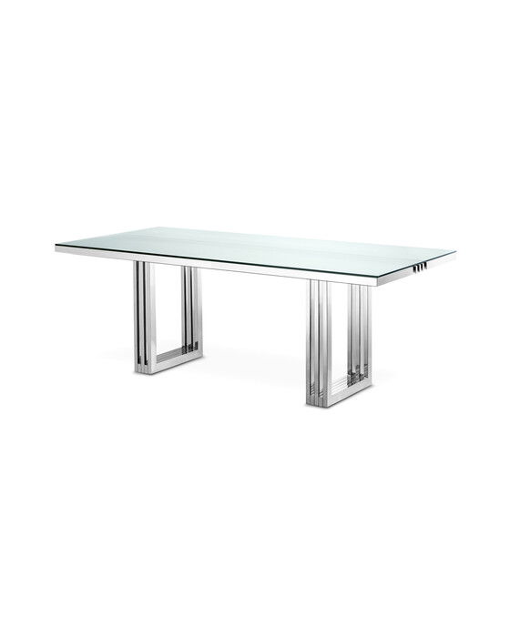 Skapa den perfekta matplatsen med matbordet Garibaldi från Eichholtz. Med sin robusta men samtidigt eleganta ram i rostfritt stål och en bordsskiva i klarglas, har detta bord en design som skapar en glamorös atmosfär.