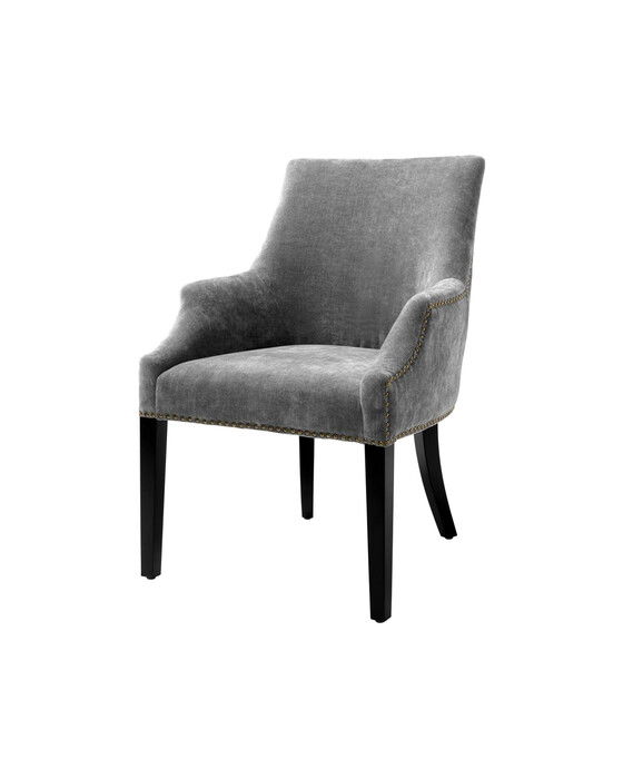 Matstol i grå sammet och nitar i antik mässingsfinish från Eichholtz. En elegant och stilfull matstol som passar perfekt vid matbordet eller som en extra sittplats i hemmet.