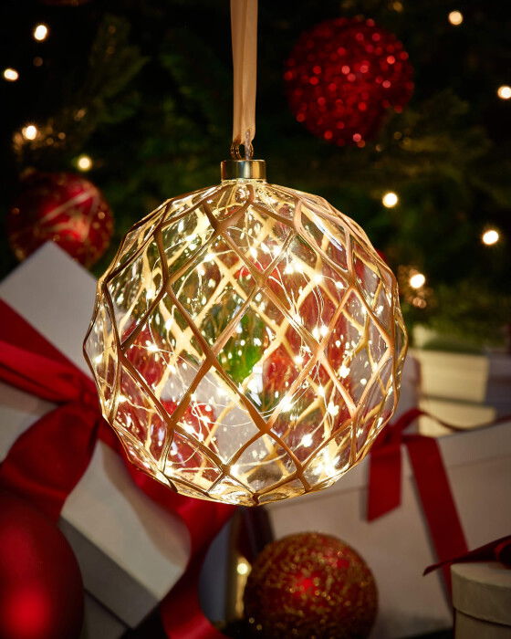 Skapa en förtrollande atmosfär i ditt hem med denna eleganta glaskula som kombinerar tidlös design med modern belysning. Kulan är tillverkad av glas och dekorerad med ett vackert rutmönster i guld. Den inbyggda belysningen ger ett varmt sken som reflekteras genom glaskulan och skapar en gnistrande effekt – som om julstjärnor vore fångade inuti. Perfekt att hänga i fönstret.