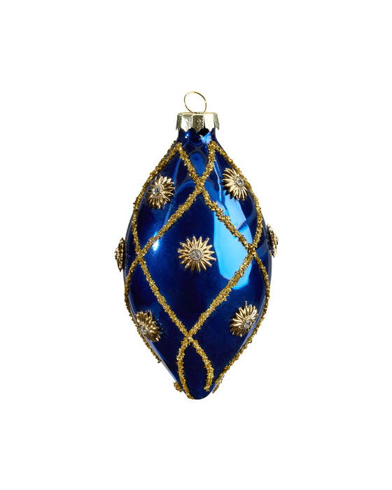 Millie teardrop julkula är en vackert dekorativ detalj med en underbart klassisk skönhet. Den har en elegant elongated teardrop form i en härligt inbjudande mörkblå färg med detaljer i guld och glitter. Millie är en dekoration som förgyller din gran och ger ditt hem en mysig julkänsla.