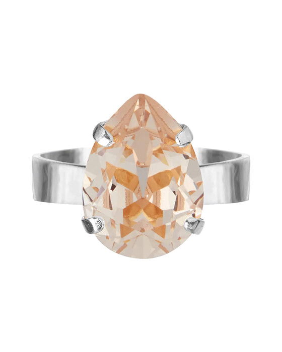 En tidlös och elegant ring med en droppformad kristall i färgen silk. Tillverkad av finaste kristall och rhodiumpläterad mässing, passar denna nickeljämna ring perfekt för både vardag och fest. Handgjord och levereras i signaturask av Caroline Svedbom.
