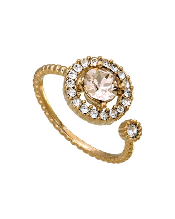 Miranda är en stilfull ring från Lily and Rose med en större champagnefärgad sten fäst i en cirkel av mindre, klara kristaller. Ringens bas är tillverkad i guldpläterad mässing och toppas med en mindre klar kristall. Ringen är justerbar och passar flera storlekar.