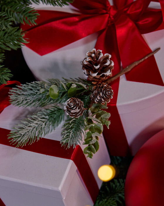 Skapa en vinterkänsla med Mirelle tallkvist grön, med sina snötäckta barr och dekorativa kottar. Denna naturliga design är mångsidig och passar perfekt som dekoration i en krans, på julbordet eller som en detalj på julklapparna. Med sin tidlösa charm lyfter den helgens dekorationer till en ny nivå.