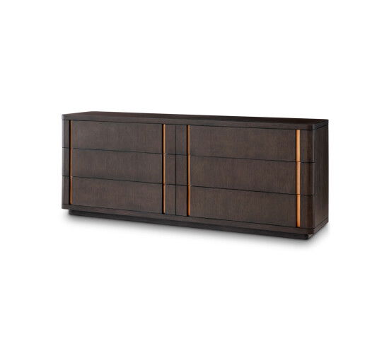 Modesto byrå är ett mästerverk som utstrålar lyx i ditt sovrum. Omfamna rikedomen hos mocha ekfanér, medan den borstade mässingsfinishen lyfter designen till nya höjder av storslagenhet. Njut av både stil och funktionalitet med Modesto byrån, en felfri förvaringslösning som förhöjer den lyxiga atmosfären i ditt sovrum.