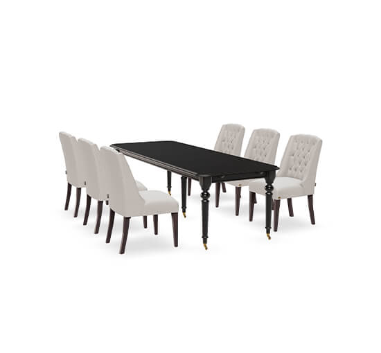 En elegant matgrupp bestående av Modus matbord tillsammans med Venice matstol. Modus är ett gediget och klassiskt förlängningsbart matbord med iläggsskivor i en elegant svart färg. Det vackra matbordet har omsorgsfullt snidade detaljer och vilar på praktiska hjul så det enkelt kan flyttas. Venice är en tidlös och stilfull matstol, omsorgsfullt tillverkad av utvalda materialval för att skapa rätt balans mellan kvalité och design. Med sitt pikerade långa ryggstöd med knappar och mjuka stoppning av kallskum, är Venice en mycket bekväm och komfortabel matstol som andas sofistikerad lyx och elegans.