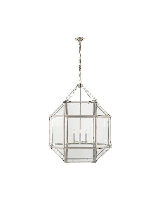 Morris taklampa från Suzanne Kasler avger charm till alla typer av kök eller entréer. Klara eller vita glasrutor pryder den geometriska ramen i antik zink, polerat nickel eller förgyllt järn, vilket ger alternativ för ljusare eller mer diffuserad belysning.