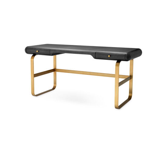 Uppgradera din arbetsplats med Nathaniel-skrivbordet, som har en slående ekfanér i kolgrått och en snygg borstad mässingsfinish. Dess mjukt rundade silhuett och dubbla lådor blandar sofistikerad design med funktionalitet, vilket gör det till ett perfekt val för dem som uppskattar lyxig design. Denna möbel utstrålar tidlös elegans och samtida lockelse.