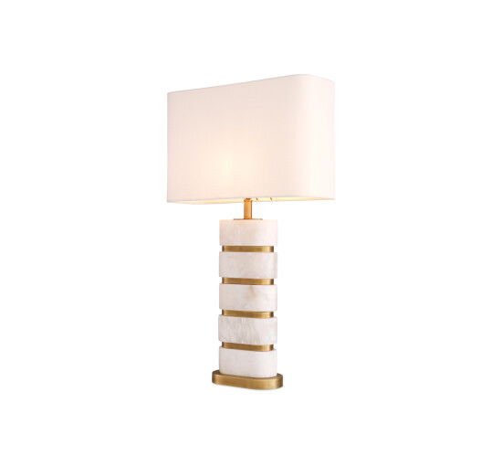 Denna eleganta bordslampa från Eichholtz har en stilren design i antik mässingsfinish varvat med naturmaterialet alabaster. Newall kan placeras på ett nattduksbord eller sidobord i sovrum, hall eller vardagsrum och ger en stilren känsla till inredningen. En rektangulär vit lampskärm ingår för att ge ett behagligt ljus.
