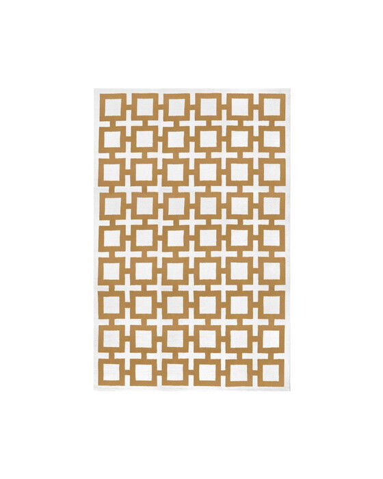 Den moderna Nixon-mattan erbjuder ett glamoröst grafiskt mönster i färgerna camel och vitt. Tillverkad av skickliga matthantverkare i Peru med traditionella metoder, är denna plattvävda och vändbara matta både mjuk och hållbar.
