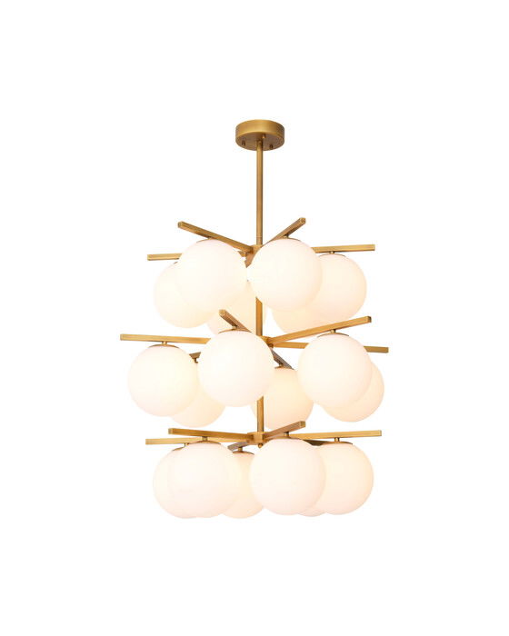 Den eleganta taklampan Noa tillför en harmonisk känsla och ger en touch av modernitet och nytänkande med sin unika design. Fina sfäriska vita glasbollar sprider ett mjukt och varmt ljus i hela rummet, medan den antika mässingsfinishen ger lampan sin eleganta helhet.