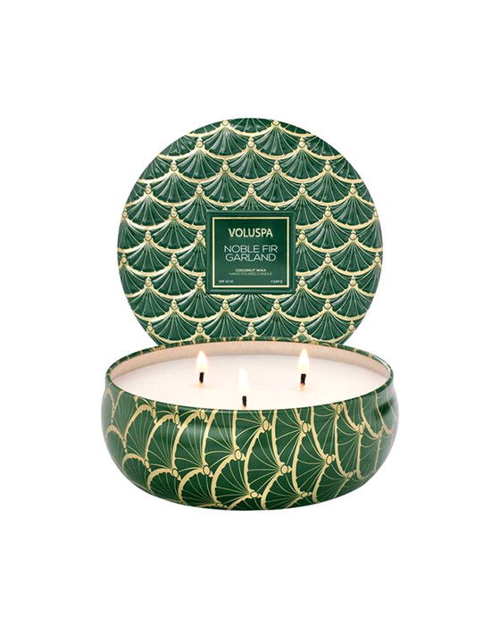 Voluspa Noble Fir Garland är ett lyxigt doftljus av krämig kokosvax som sprider en generös doft av ädelgran, cederträ, bärnsten, mysk och kardemumma. Med en lång brinntid och klar låga fyller detta ljus ditt rum med en ljuvlig doft av högtidens anda och glans.