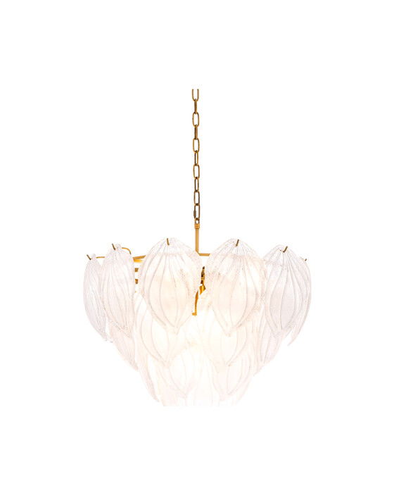 Novida takkrona i mässingsfinish och glas från Eichholtz är en elegant takkrona som är ett smycke för rummet. Med frostade blad i glas skapas en botanisk atmosfär. Oavsett var den placeras blir den en vacker detalj, passande för loungen eller sovrummet. Taklampan rymmer nio ljuskällor.