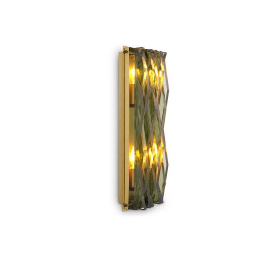 Den stora Nuvola vägglampan är ett imponerande inslag i ditt rum med sitt slående reliefmönster av grönt glas och antika mässingsarmatur. Ljuset bryts vackert genom glaset och skapar ett fantastiskt ljusspel i din interiör.