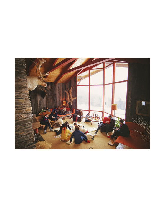 En grupp människor som kopplar av på stockmäklaren A Albert Sack Jr’s chalet på skidorten Sugarbush Mountain i Warren, Vermont, cirka 1960. Välj mellan olika alternativ för konstverkets leverans och inramning.