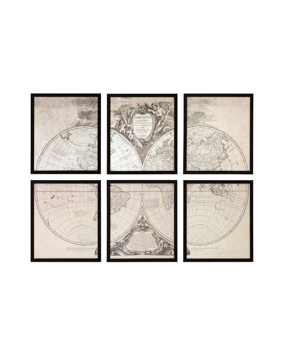 Orbis Vetus från Eichholtz är en kombination mellan rymden och vintage som passar perfekt till kontoret eller vardagsrummet. Uppsättningen på sex tavlor innefattar individuella bilder som tillsammans bildar jorden från två olika perspektiv. Tavlorna kommer i en elegant svart träram med en skiva av klarglas.