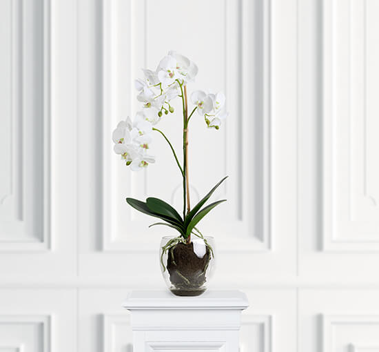 Denna högkvalitativa konstgjorda orkidé är den perfekta inredningsdetaljen som alltid blommar. Med en naturtrogen känsla och eleganta vita blommor skapar denna orkidé en ståtlig botanisk atmosfär i vilket rum som helst.