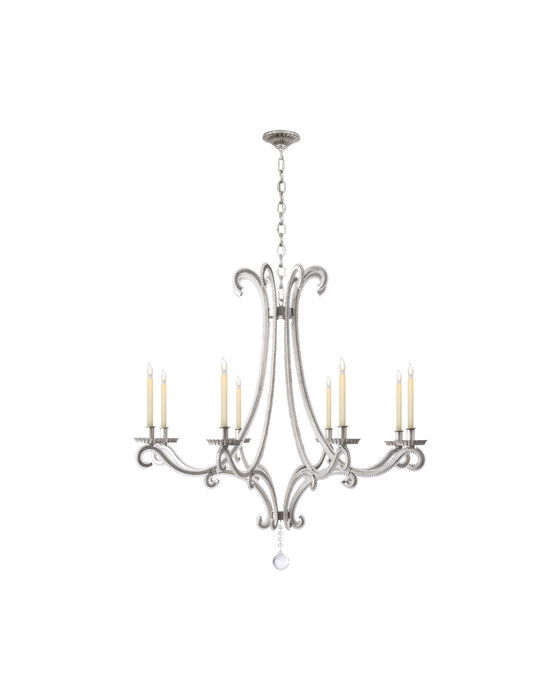 Oslo takkrona återskapar klassisk nordeuropeisk elegans med en modern Chapman & Myers-twist. Graciösa böjda linjer i förgyllt järn är omsorgsfullt trimmade med glaspärlor, vilket ger den klassiskt proportionerade ljuskronan en känsla av förfining. De smyckesliknande detaljerna, de skulpterade bobecherna och de ljusinspirerade lamporna ger inredningen en sofistikerad touch.
