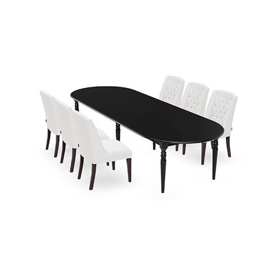En elegant och stilren matgrupp bestående av Osterville matbord och sex stycken Venice matstolar. Osterville är ett gediget och klassiskt förlängningsbart matbord med iläggsskivor med omsorgsfullt snidade detaljer. Venice är en tidlös och stilfull matstol, omsorgsfullt tillverkad av utvalda materialval för att skapa rätt balans mellan kvalité och design. Med sitt pikerade långa ryggstöd med knappar och mjuka stoppning av kallskum, är Venice en mycket bekväm och komfortabel matstol som andas sofistikerad lyx och elegans. Alla möbler från Newport Premium Furniture är tillverkade för hand i exklusiva materialval med gedigen kvalitet.