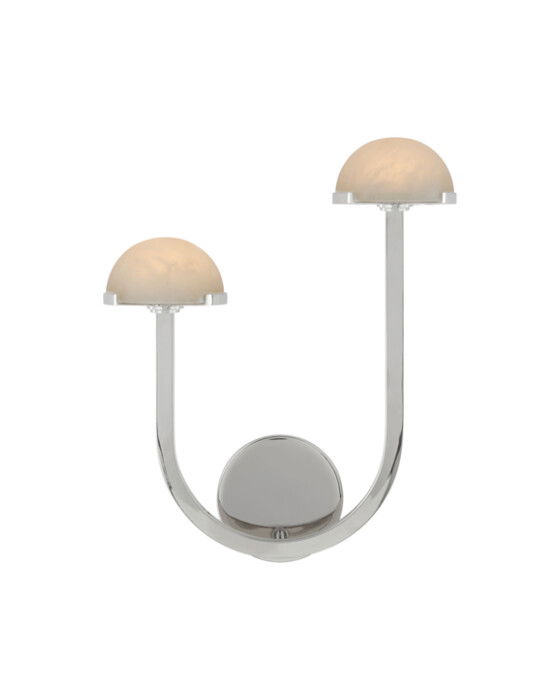 Denna ultra-moderna men ändå varma och välkomnande vägglampa från Kelly Wearstlers Pedra-serie kombinerar eleganta metallformer med den naturliga skönheten och mångsidigheten hos alabaster. Med sina kupolformade skärmar och linjära och rundade metallinjer skapar den en simpel elegans som vackert kommer att belysa dina interiörer.