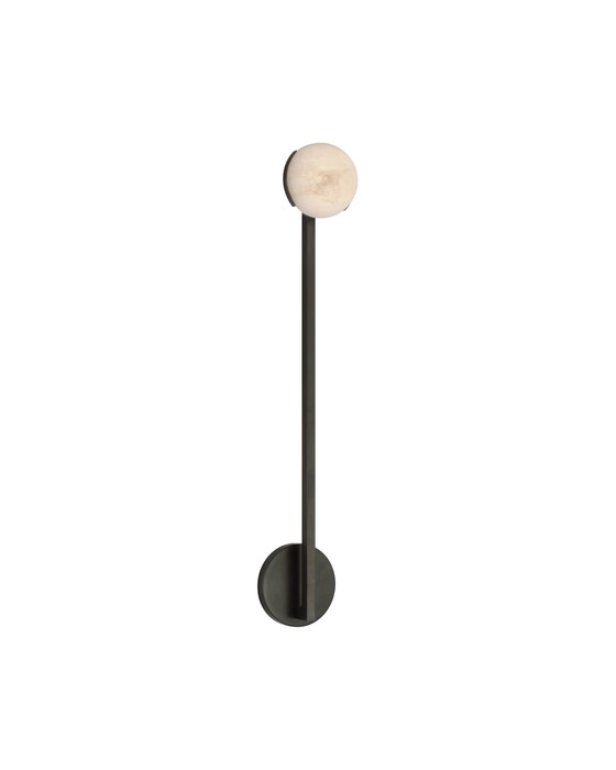 Denna ultra-moderna vägglampa från Kelly Wearstlers Pedra-serie kombinerar eleganta metallformer med den naturliga skönheten hos alabaster, skapar en varm och välkomnande belysning för dina interiörer.