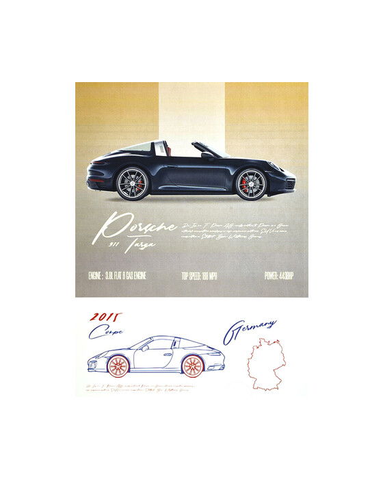En elegant hyllning till Porsche 911 Targa, en bil som definierar lyx och prestanda. Denna tavla kombinerar en stilren sidovy av bilen med detaljer om dess imponerande specifikationer – 3,0L flat-6-motor, 443 hästkrafter och en toppfart på 188 mph. Perfekt för bilälskare och Porsche-entusiaster, denna tavla förenar modern precision med tidlös design.