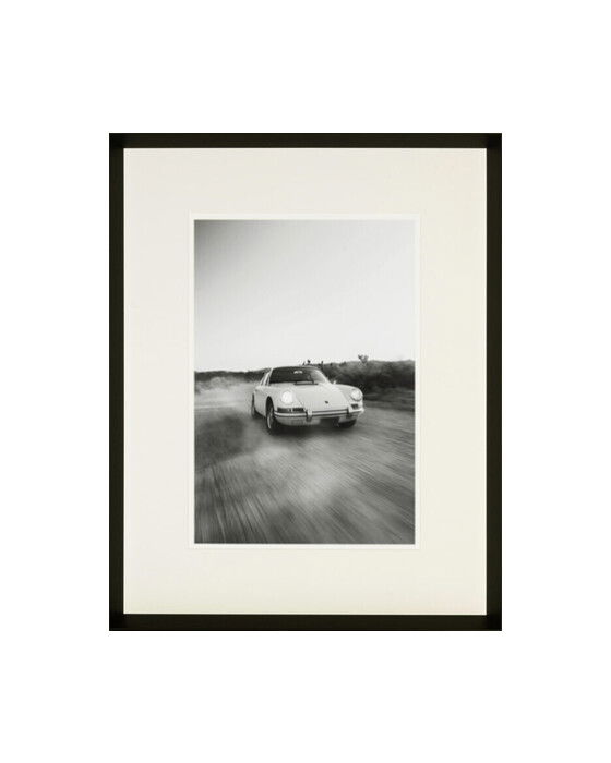 En kraftfull svartvit bild som fångar ögonblicket när en klassisk Porsche susar fram längs en dammig väg. Rörelsen, dammet och bilens ikoniska design skapar en dramatisk känsla av frihet och äventyr. En tavla som kombinerar nostalgi och modern elegans, och som för tankarna till fartfyllda resor genom tidlösa landskap.