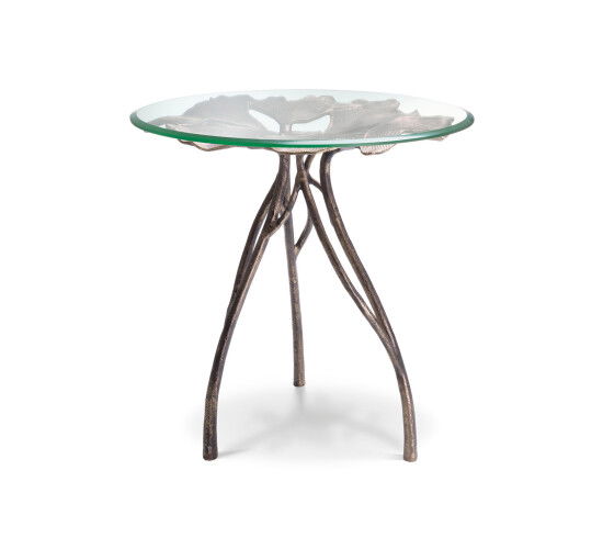 Utforska det förtrollande Poseidon sidobordet, med sitt vackra ginkgo-lövmönster och klassiska mässingsfinish. Med en topp av klarglas kombinerar detta bord konstnärlig design med praktisk funktion. Poseidon sidobord är en elegant möbel som ger en touch av naturlig skönhet och sofistikering till vilket vardagsrum som helst.