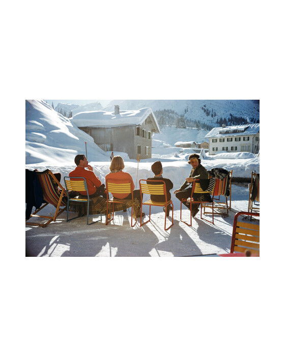 En grupp människor som sitter i solen på Gasthof Post-hotell i den österrikiska skidorten Lech, 1960. En vacker och tidlös bild av avkoppling och gemenskap.