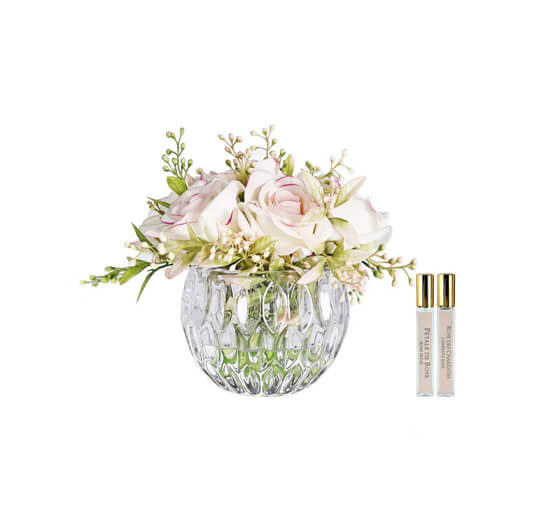 Rêve de rose är ett exklusivt set med en dekorativ blombukett som du sprayar med medföljande rumsparfym. Buketten består av konstblommor i högsta kvalitet i och kommer i en dekorativ glasvas med elegant reliefmönster.