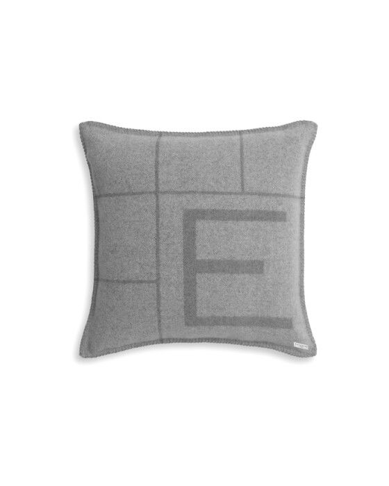 Den stilfulla kudden Rhoda från Eichholtz är tillverkad i ull och kashmir. Med en sofistikerad grå färg och ett dekorativt E i kontrastfärg ger den en exklusiv och ombonad känsla till soffan eller sängen.