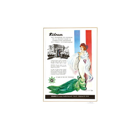 Denna eleganta motiv hyllar den franska innovationen och dess triumf inom textilindustrin. I centrum står en graciös kvinna i en vit klänning som flyter i rörelse, mot en bakgrund av trikolorens färger. Den ikoniska Triumfbågen med en böljande fransk flagga förstärker motivets patriotiska känsla och symbolik. Perfekt för den som uppskattar tidlös stil och hyllar klassisk fransk design.