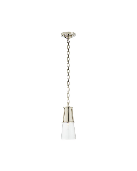 Robinson takpendel i nickel och klar glas är designad av Thomas O’Brien och inspirerad av moderniserade retrostilar. Det är en elegant uppdatering av en klassisk 1960-talslampa med retro-detaljer som bubbligt glas kombinerat med modern, polerad metall. Den koniska formen hos denna takpendel lyfter inredningen och ger rummet en sofistikerad touch.