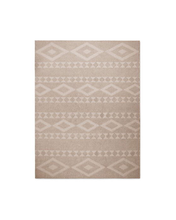 Utomhusmattan Romari är handvävd och består till 90 % av återvunna PET-flaskor. De återvunna polyestergarnerna är kända för sin snabba torktid och hållbarhet, vilket gör den perfekt för vattenresistenta utomhusmattor.